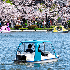 池の周囲には約200本の桜があり、春は薄桃色、夏は緑に衣替えし、秋には黄色から赤まで種々の葉に彩られます。四季折々の美しい風景を、ぜひボートに乗りながら楽しんでみてください。